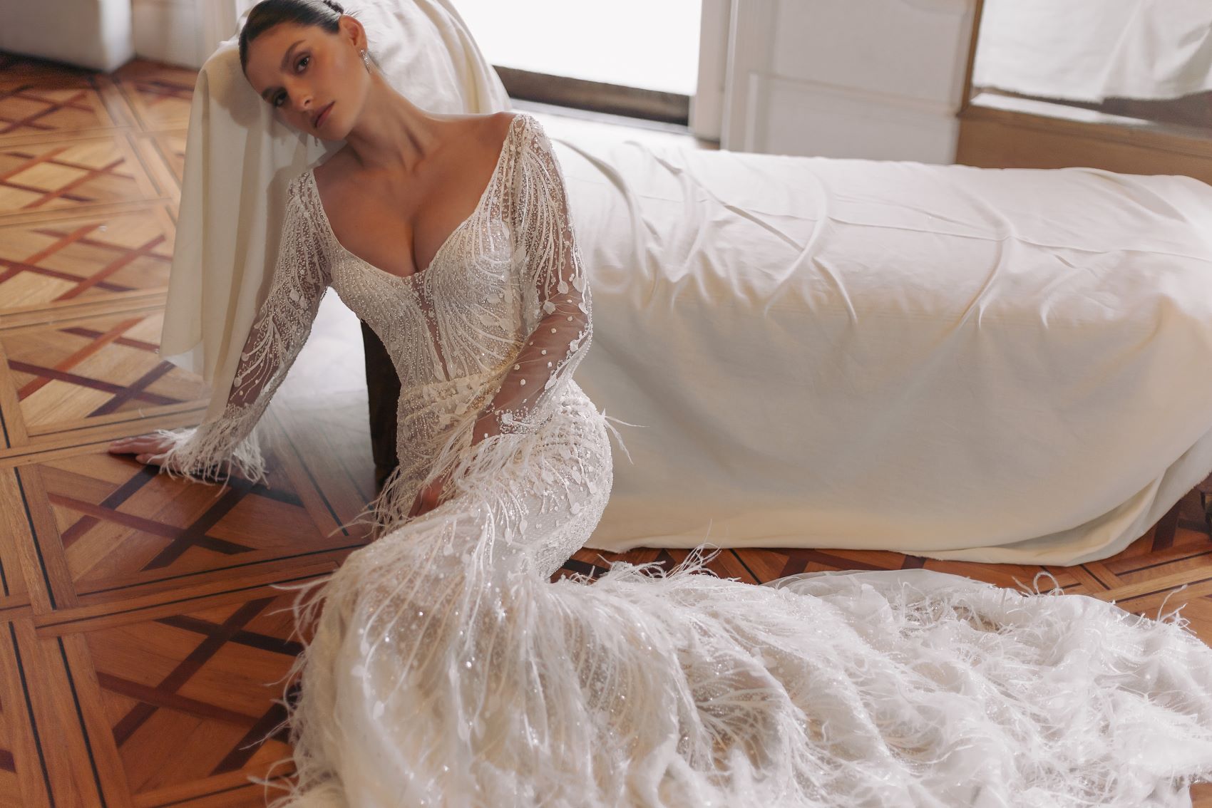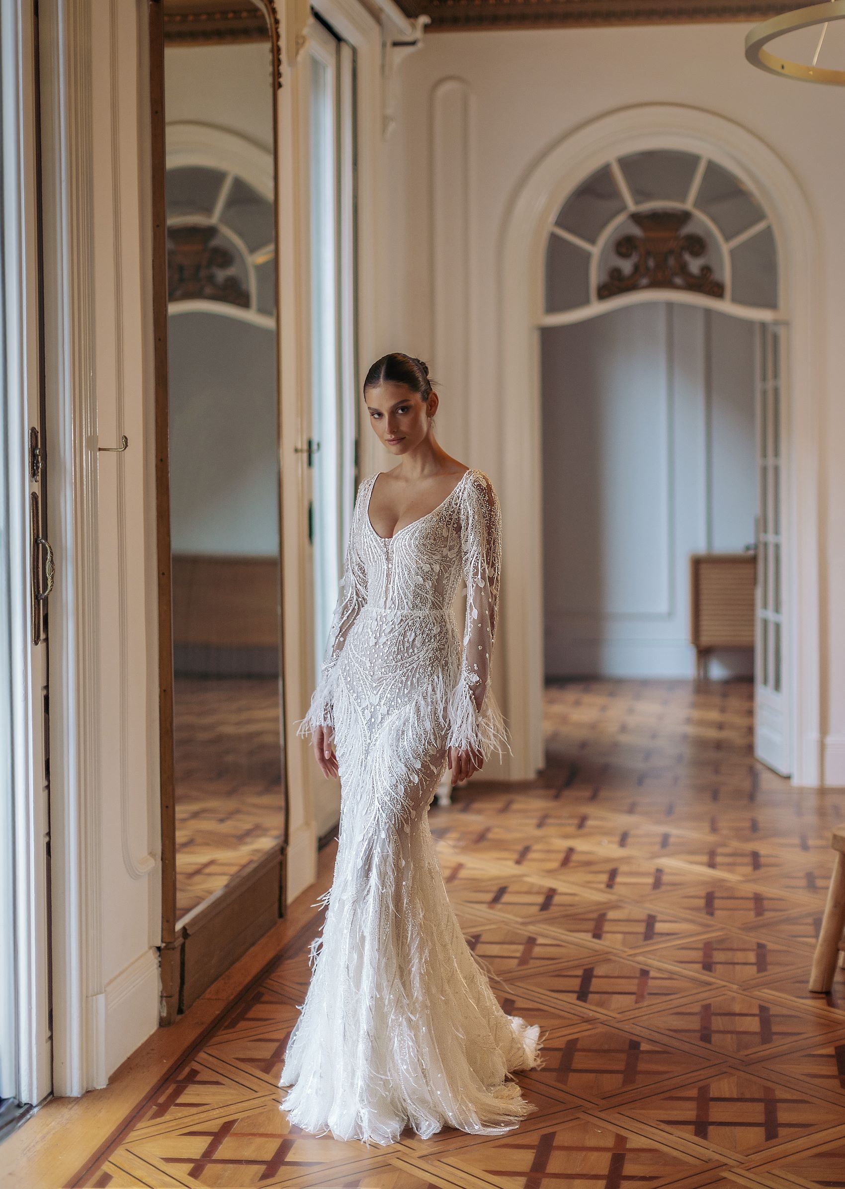 Shanti — meticulously embroidered with eastern vibe ornaments and tiny beads V-shape top, featuring feather embroidered long sleeves and feather embroidered bottom of the mermaid tail skirt. The back is half-open with round shape line.