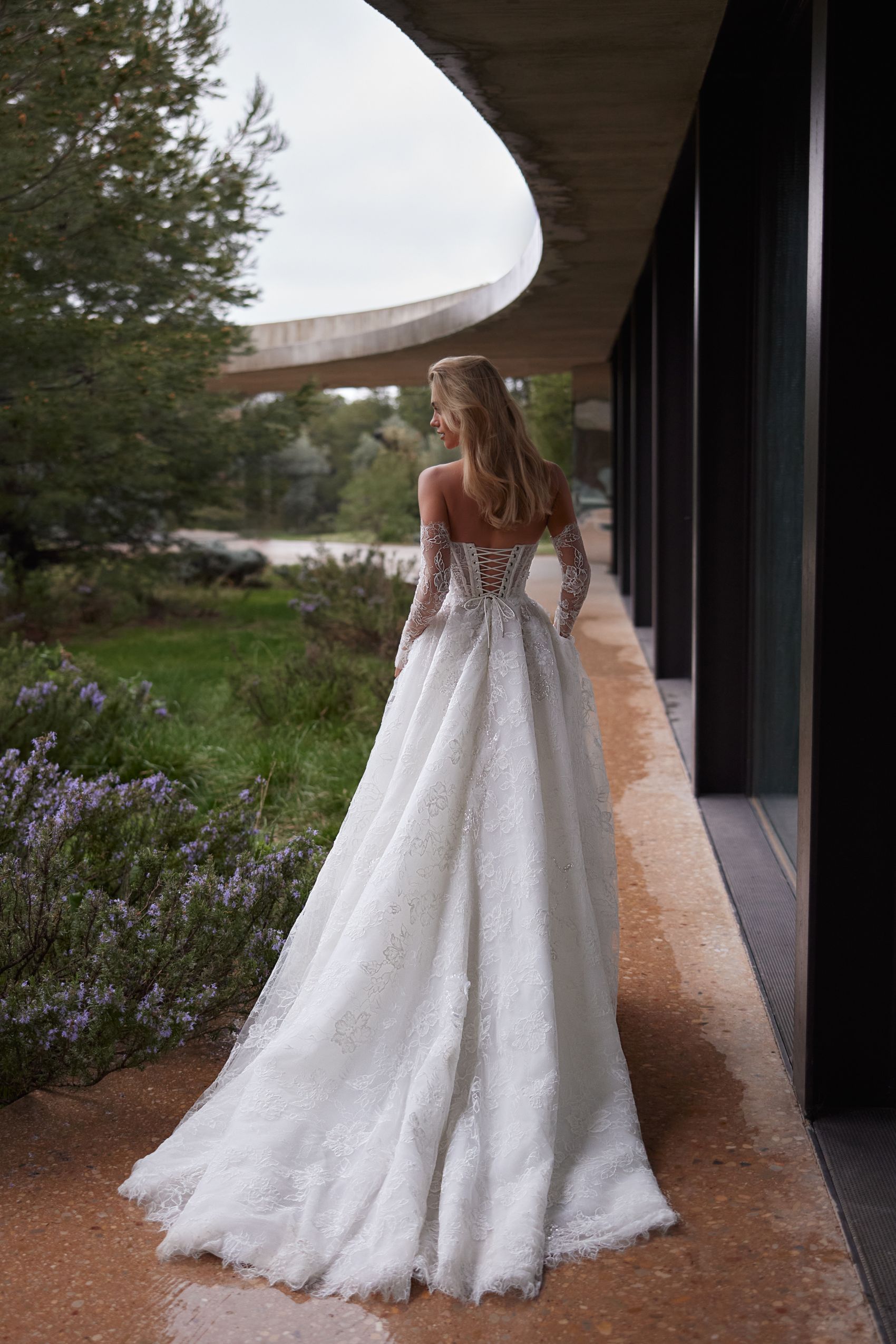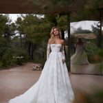 Fusta amplă, realizată din dantelă cu textură florală, oferă volum natural și o prezență ușoară, perfectă pentru miresele care își doresc un look rafinat, dar fără exagerări.