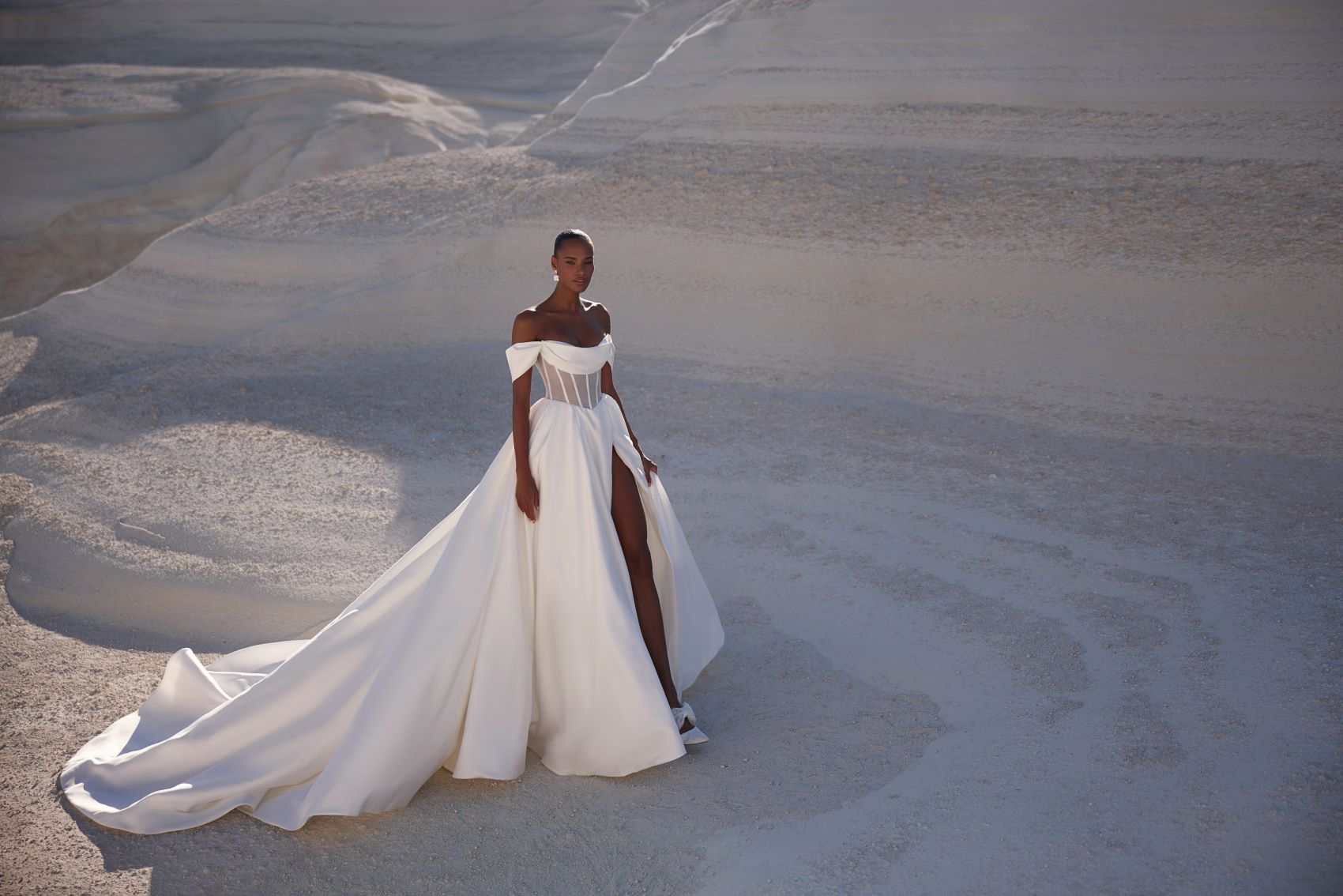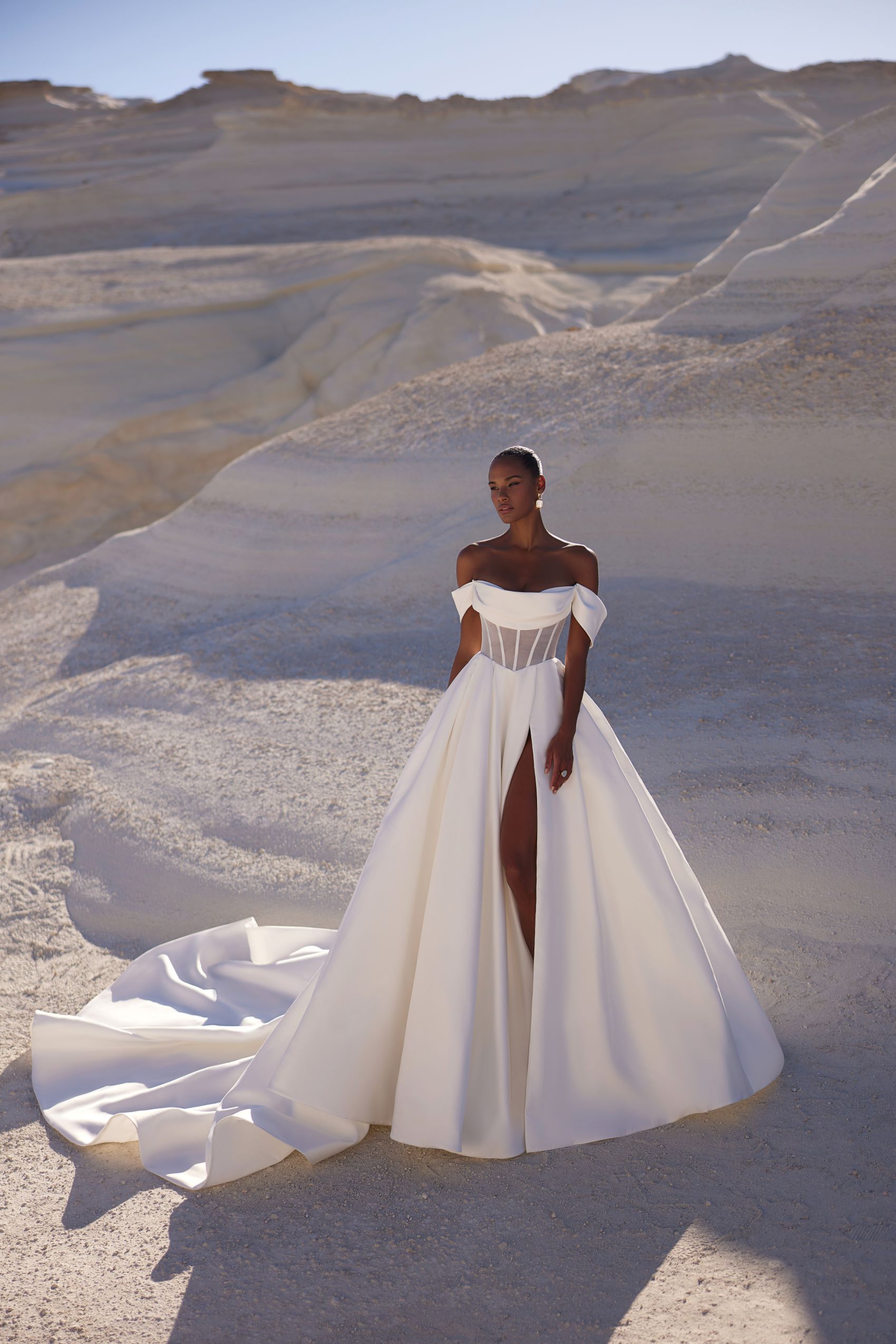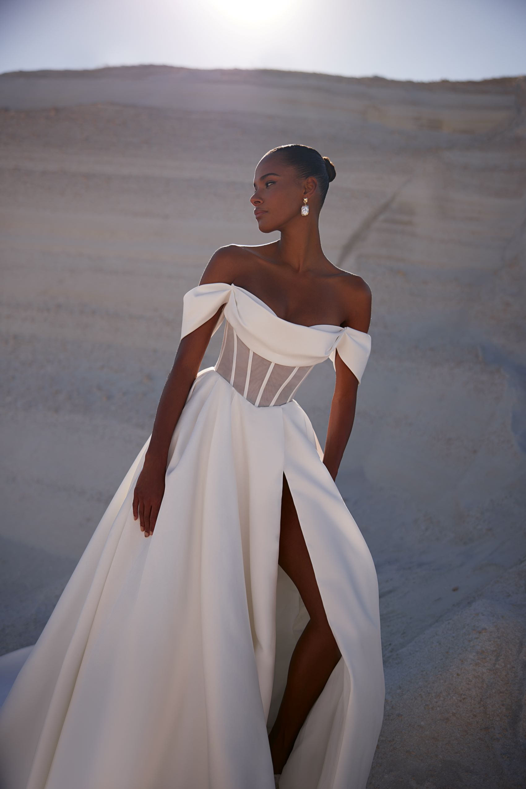Sophisticated gown with a firm corset featuring sheer panels and a softly draped neckline and sleeves. The skirt remains sleek and classic while the full-length slit on the left side adds a hint of allure to the outfit.