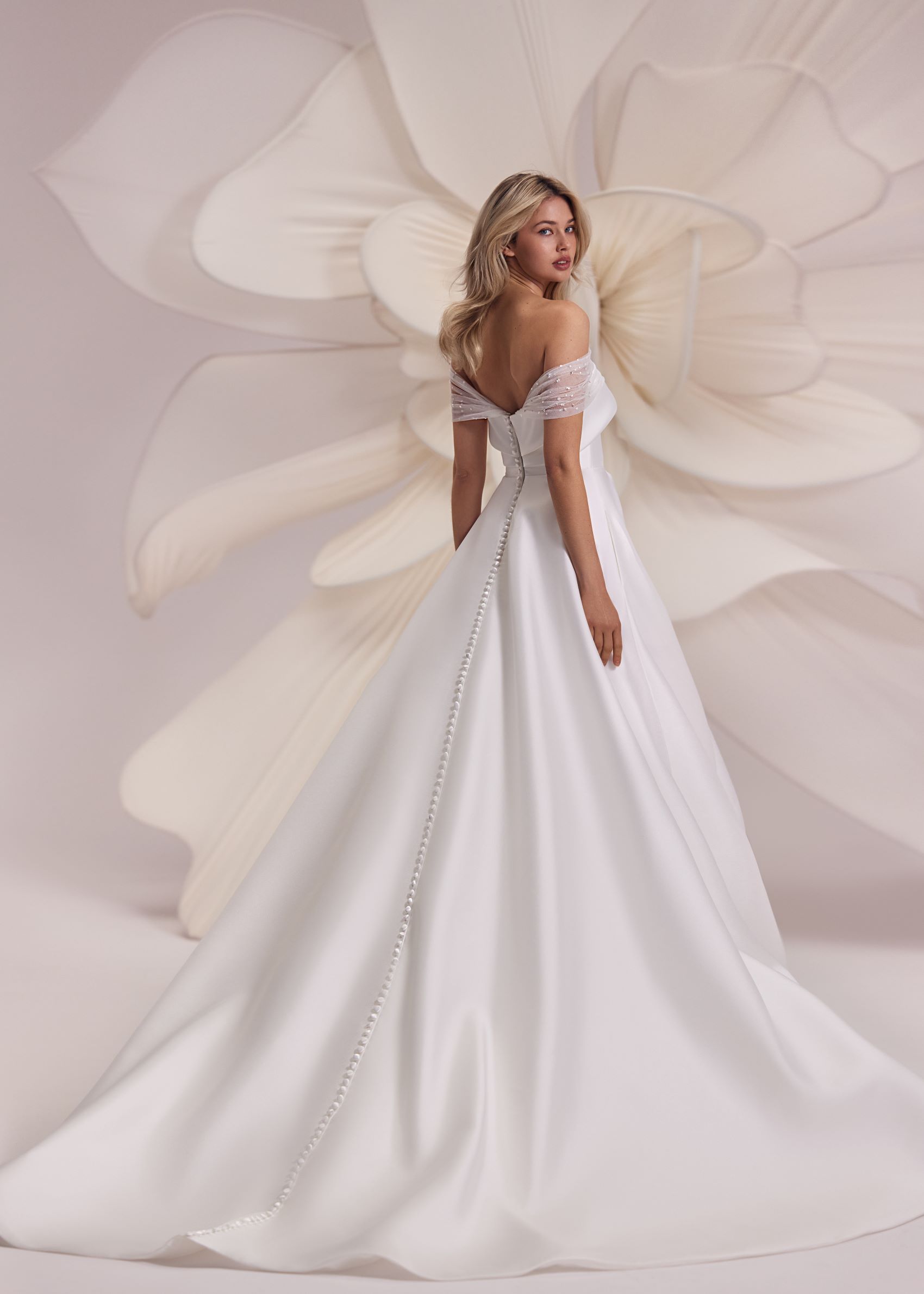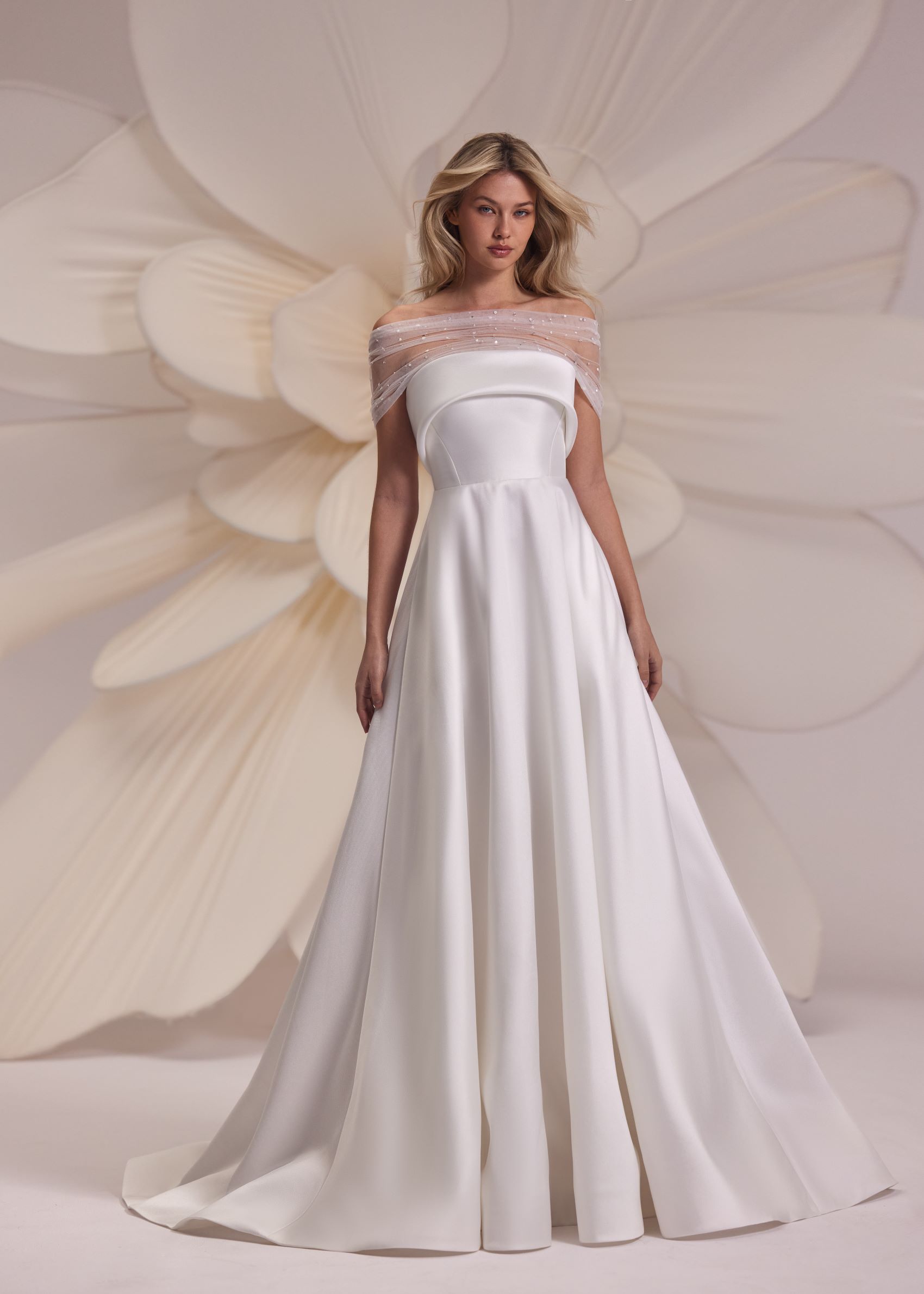 Teya – smooth strapless A-line dress decorated with a crystal line on the back and complemented with tuille cold-shoulder bolero.