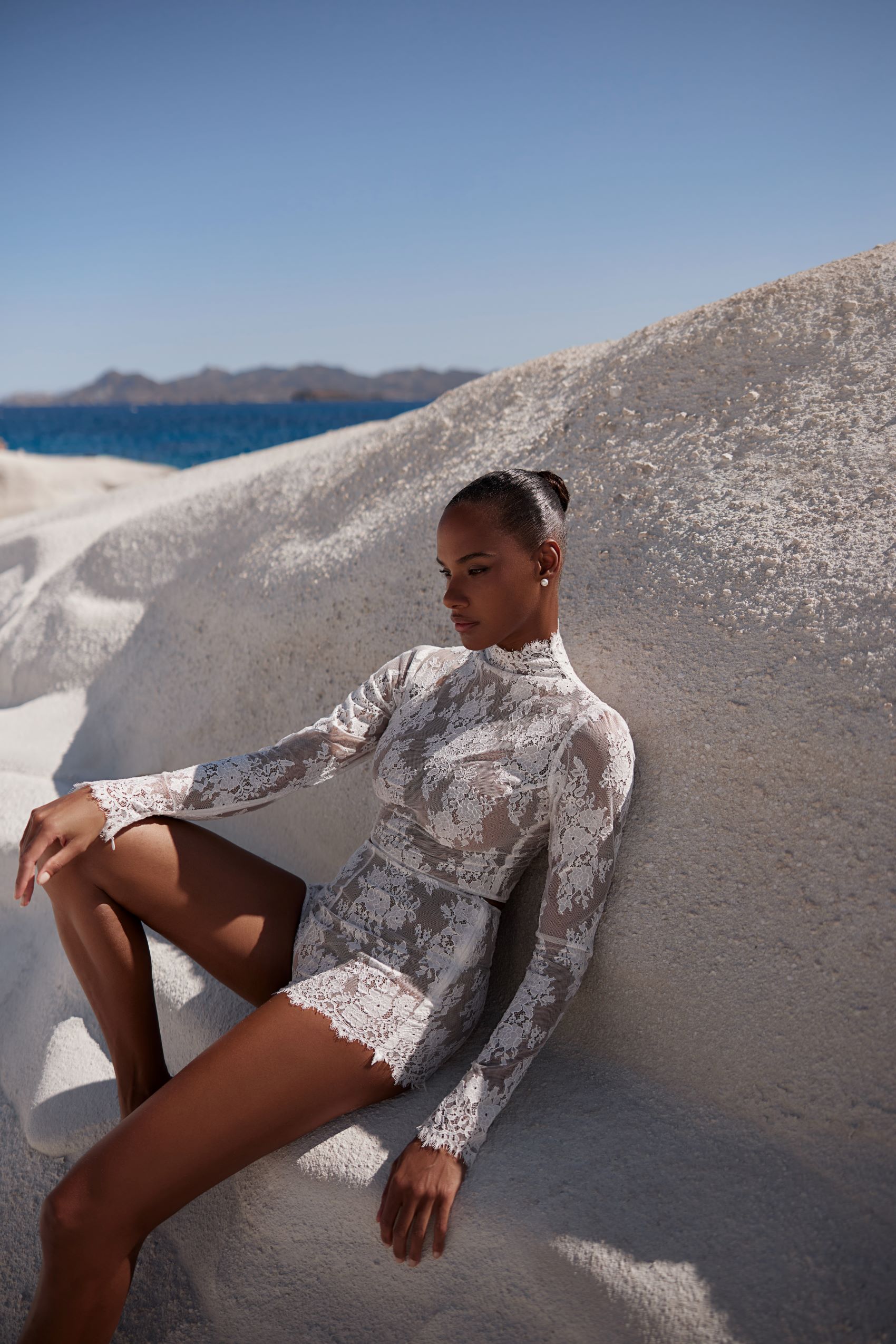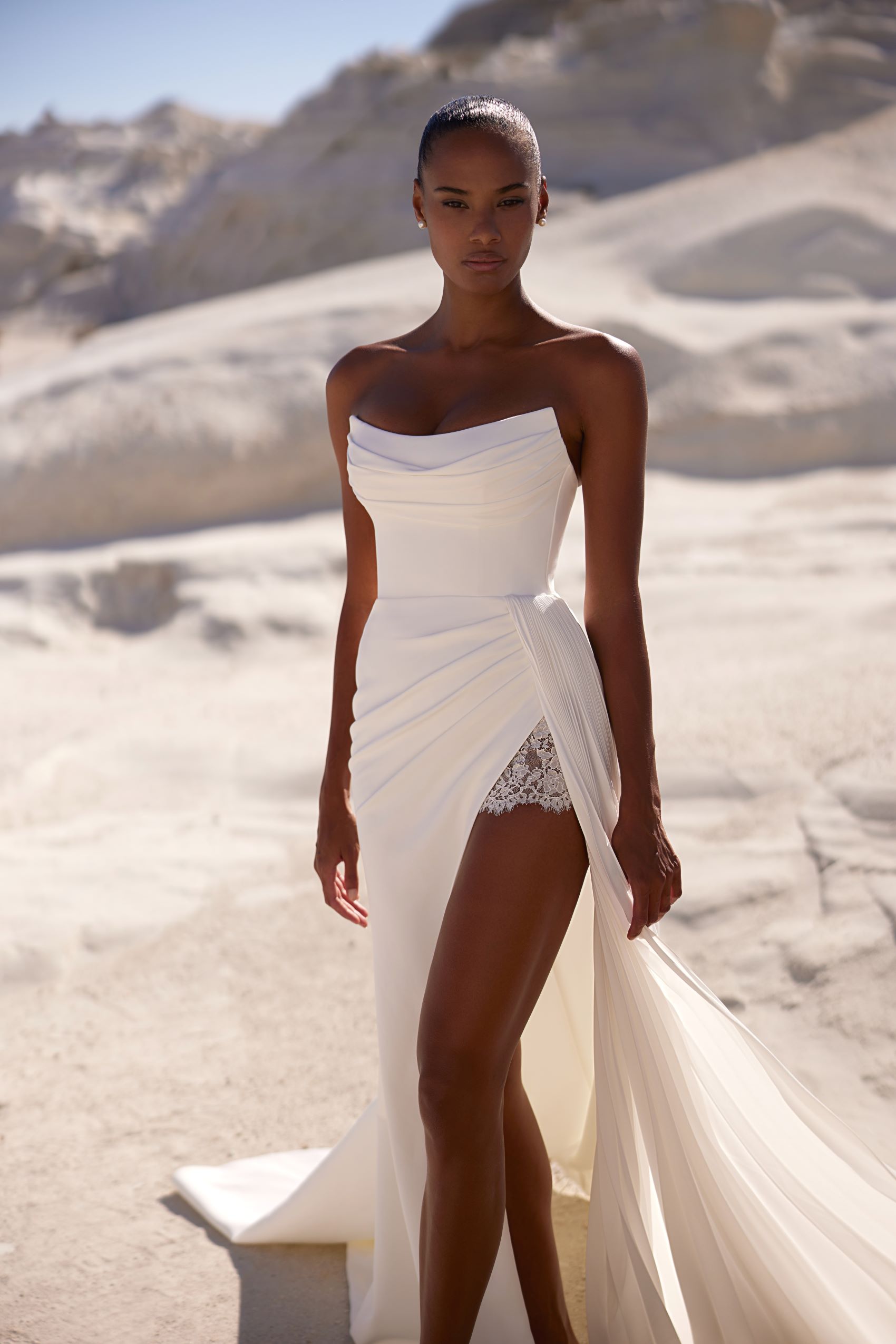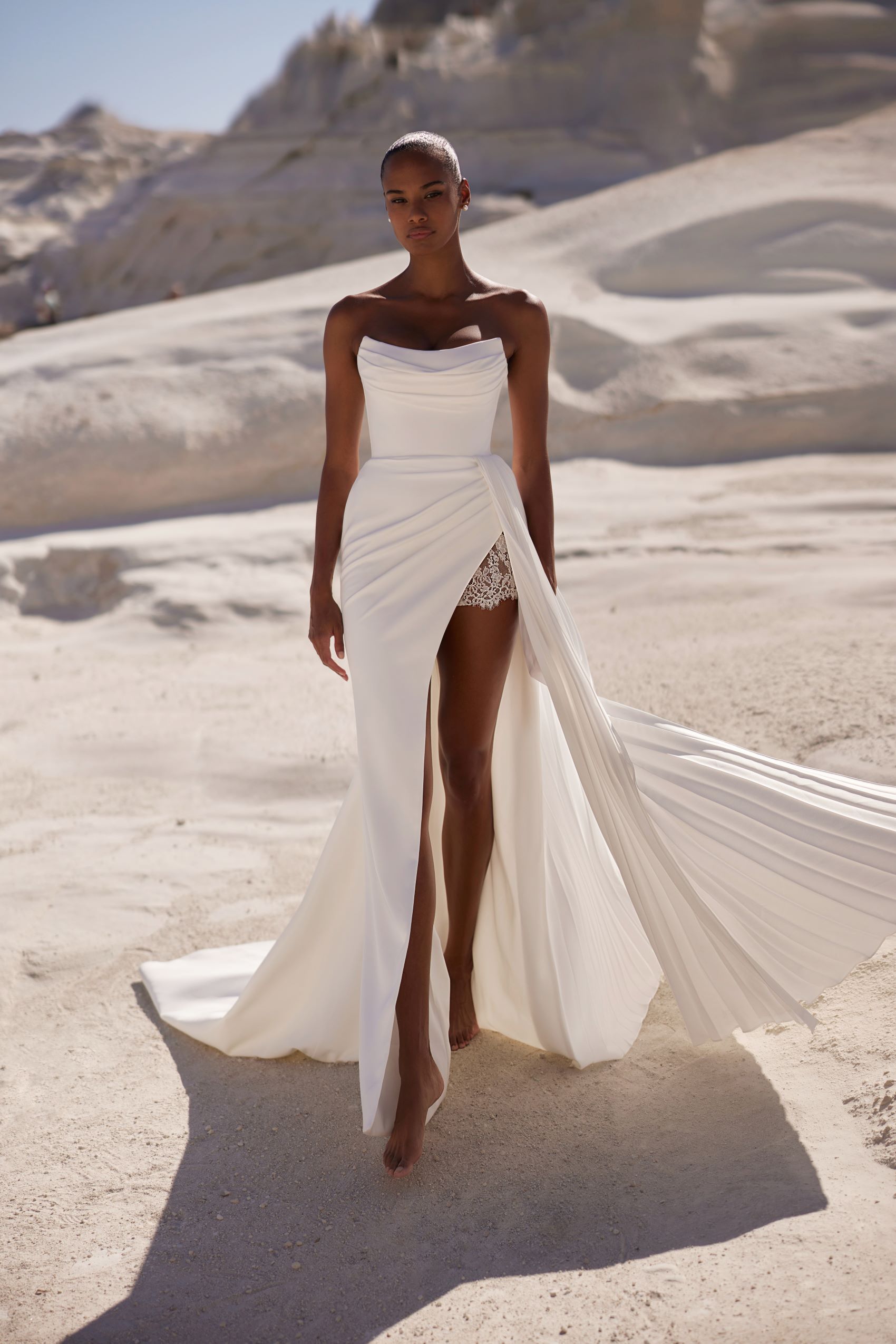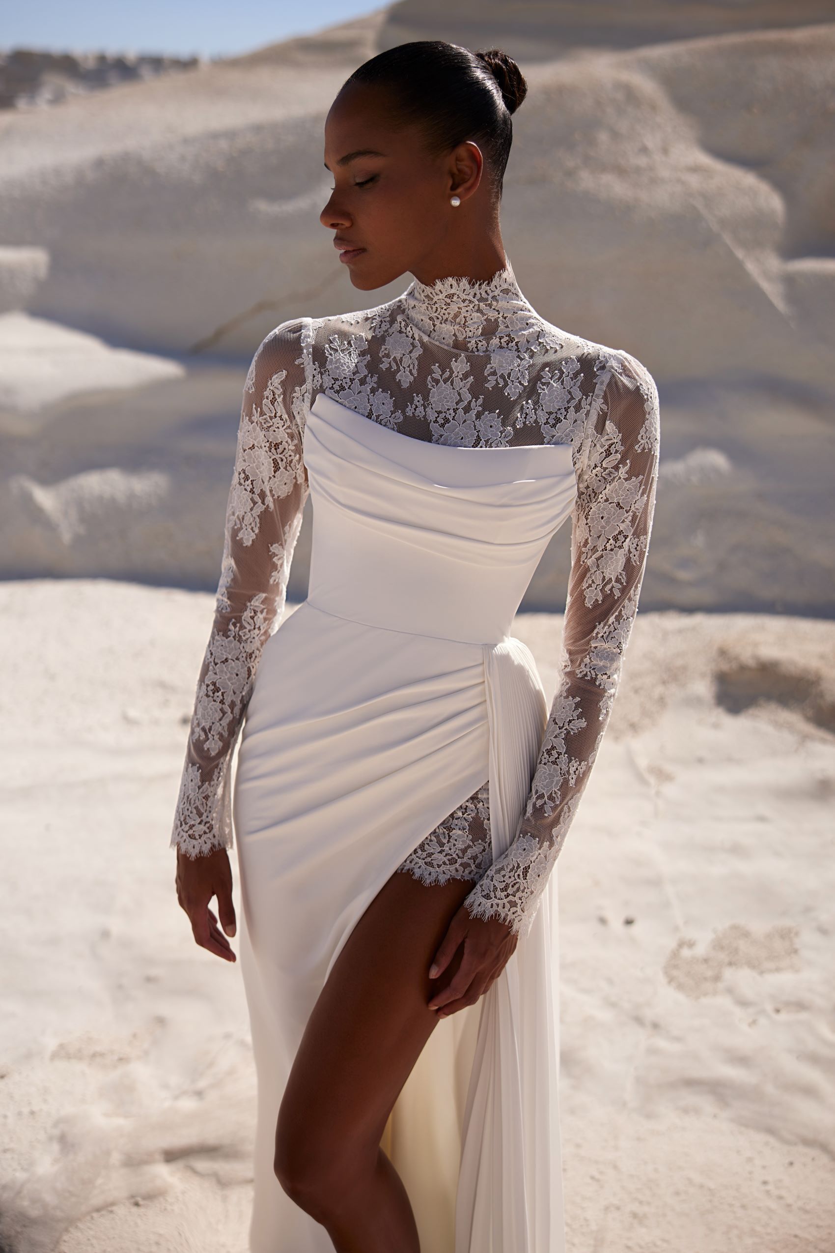 Finely detailed dress with a gently draped neckline and a fully embroidered long-sleeve turtleneck bolero under the corset. The skirt features an eye-catching slit on the left side and delicate lacework covering the hip.