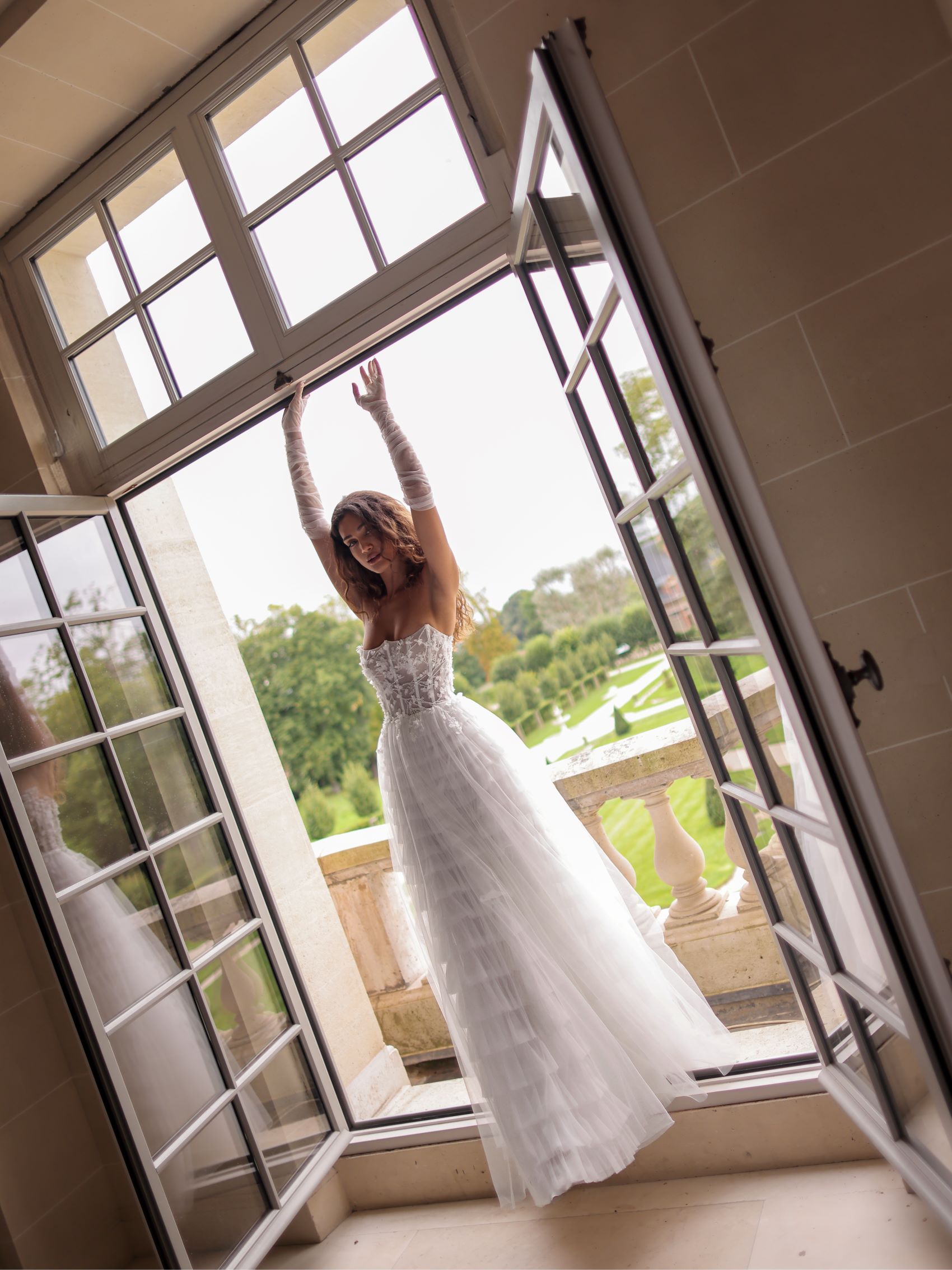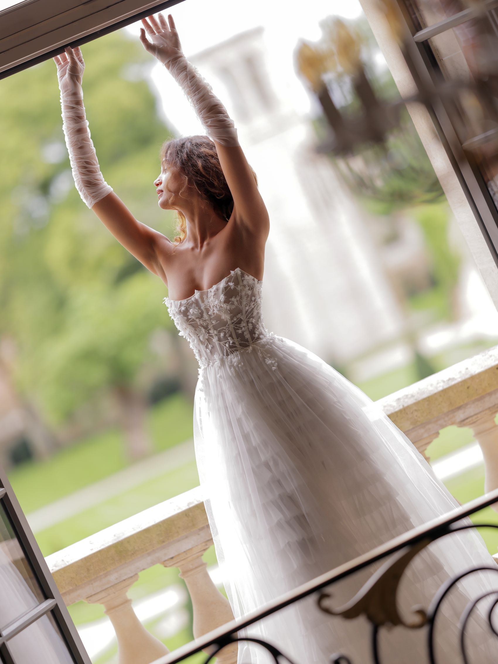 Delicate semi-sheer gown with intricate floral appliqués over the firm bodice. The natural waistline is outlined by the volume of the skirt created through shaping layered tulle ruches under the meshy gown. Detachable draped gloves complete the look.