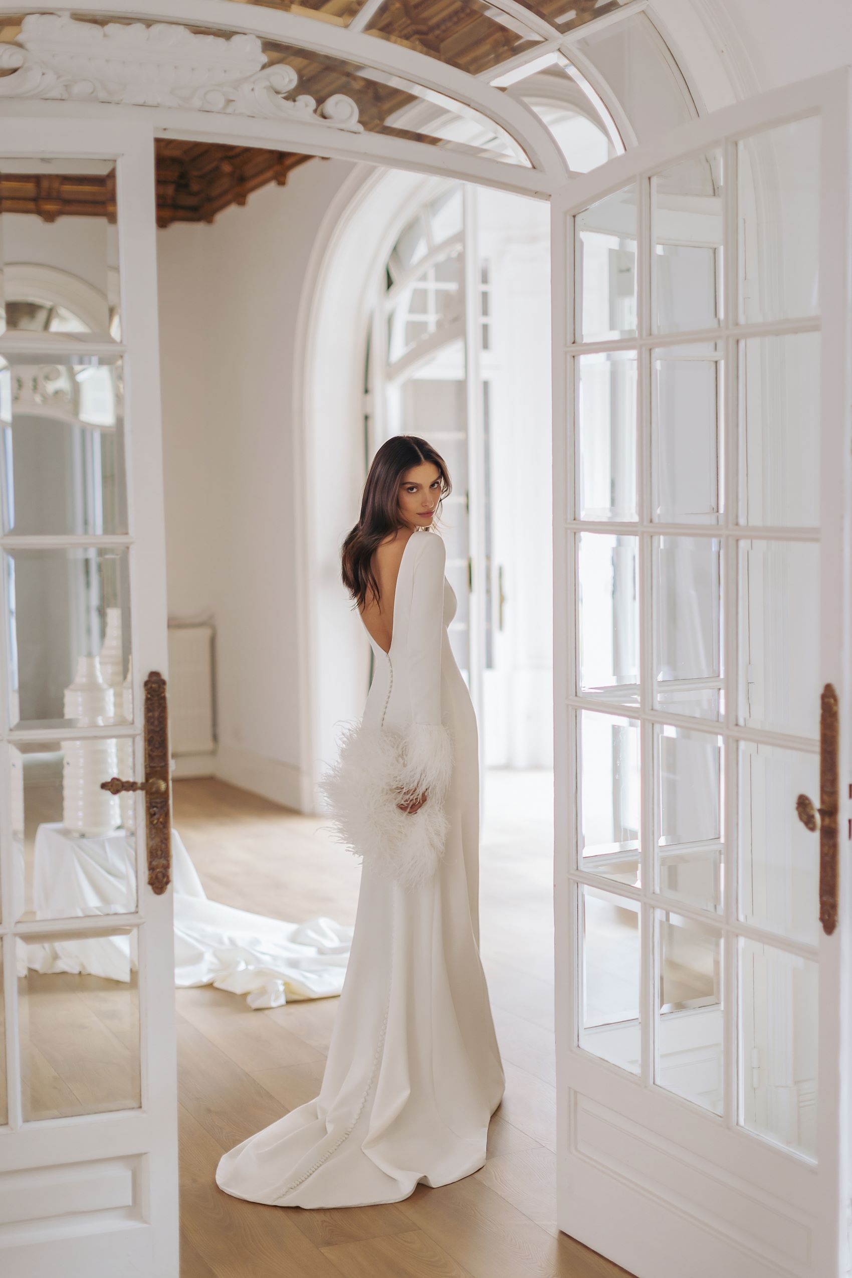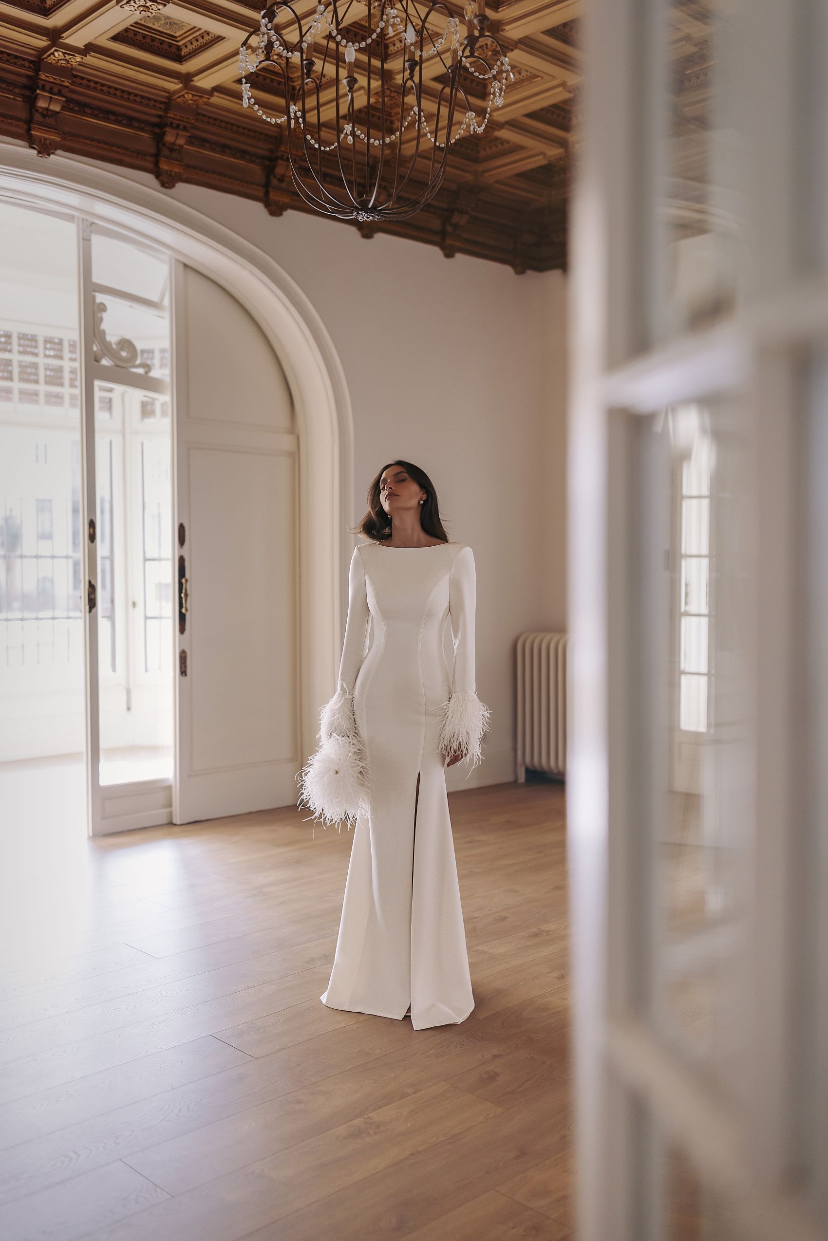 Wilda – fitted silhouette dress with boat-shaped neckline and feathered long sleeves featuring an open back and buttoned back mid-line and split smooth skirt. Complemented with a feathered accessory.