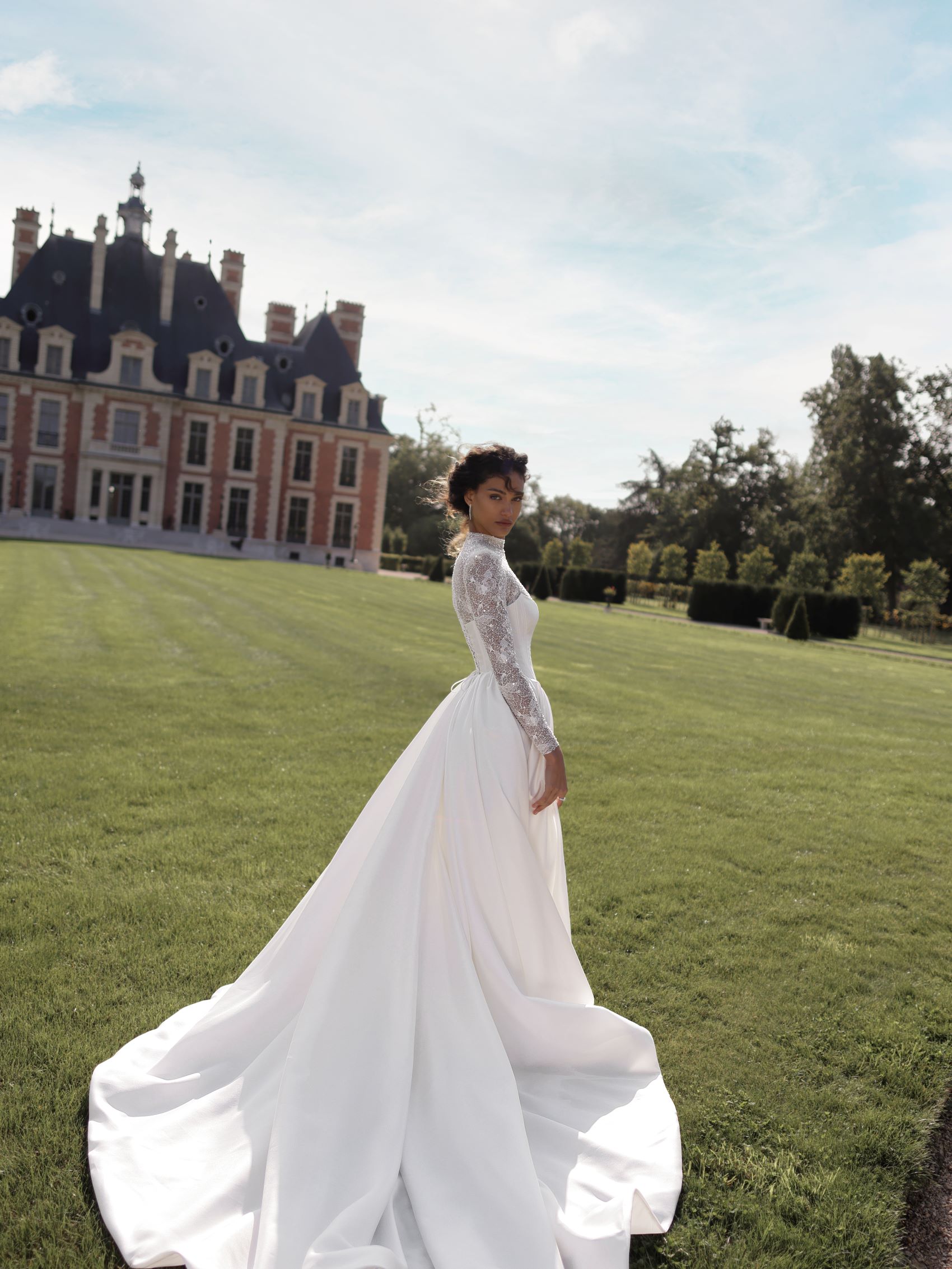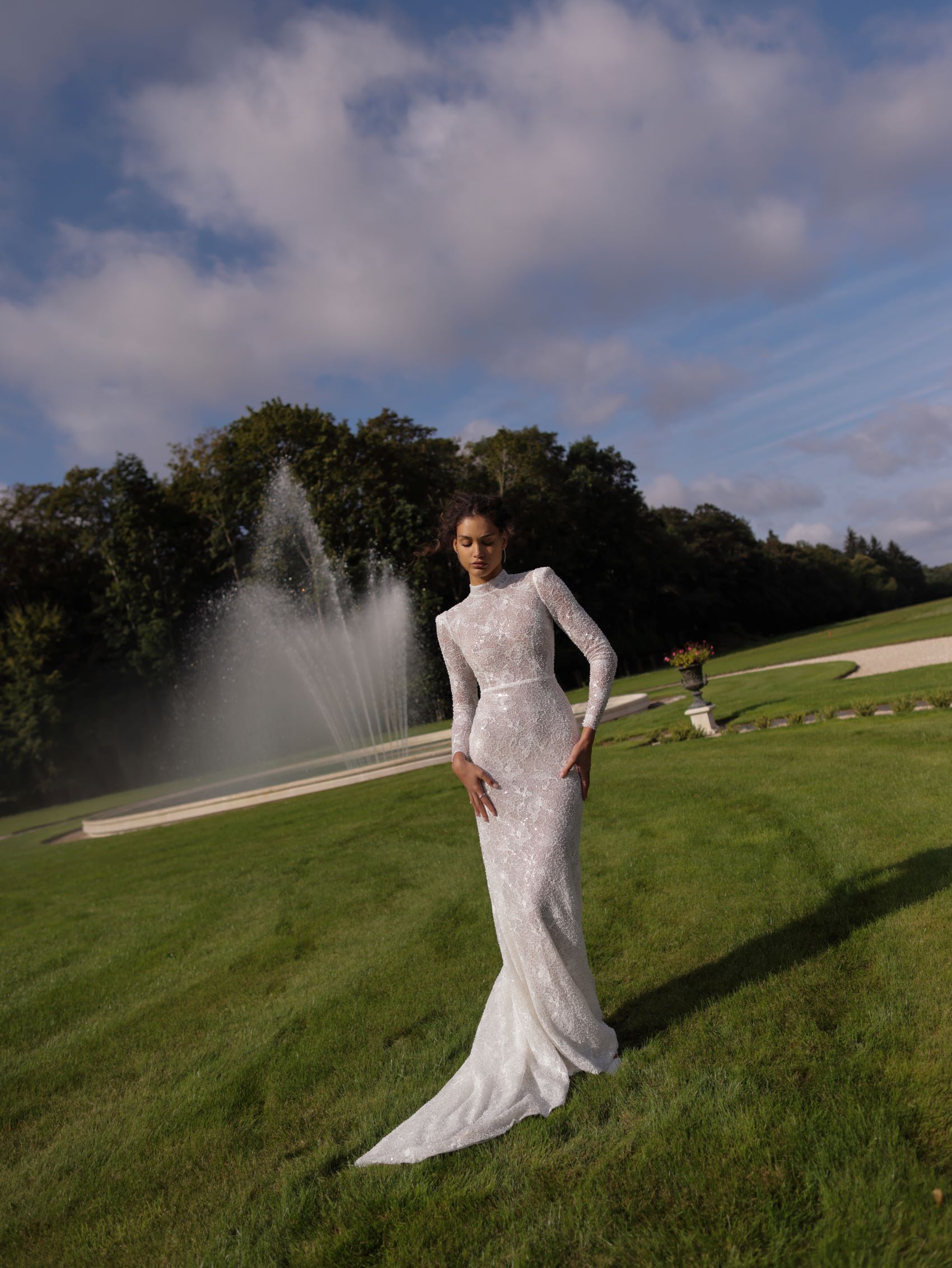Elegant gown blending two different fabrics to symbolize versatile femininity. The delicate guipure turtleneck with long sleeves flows from the sleek straight neckline corset cascading into a flowing skirt. A satin overlay on the back complements the delicate shimmer of sequins.