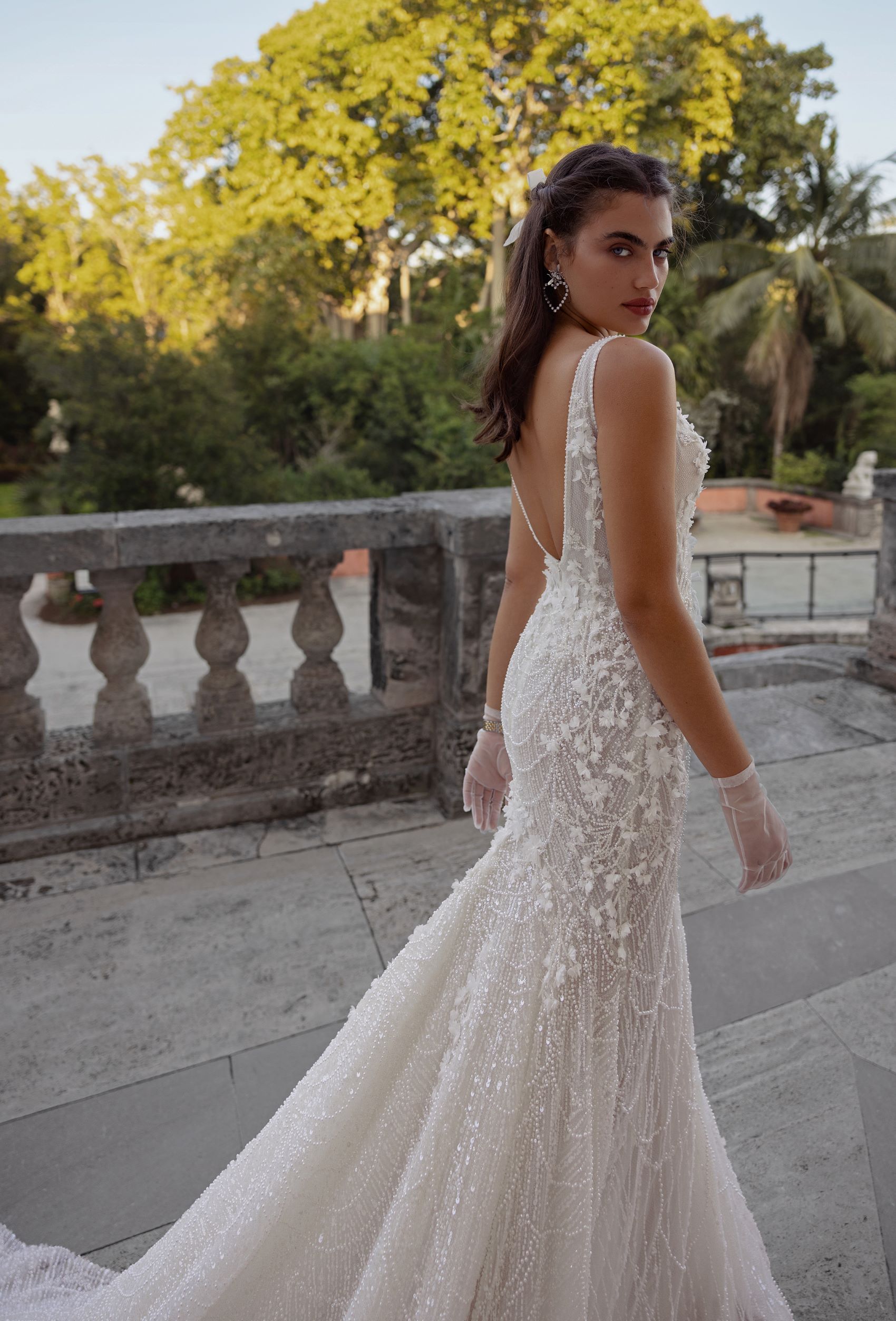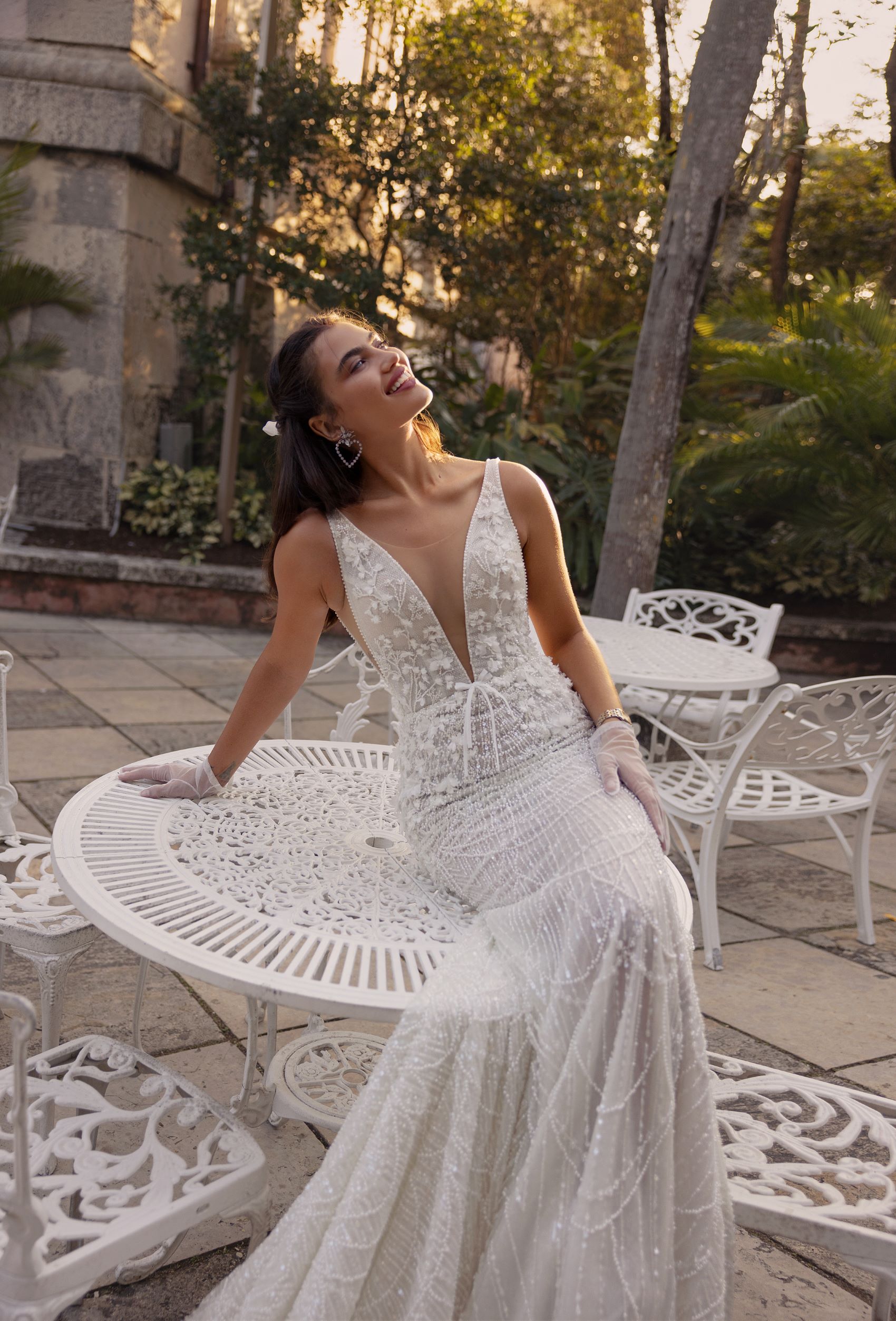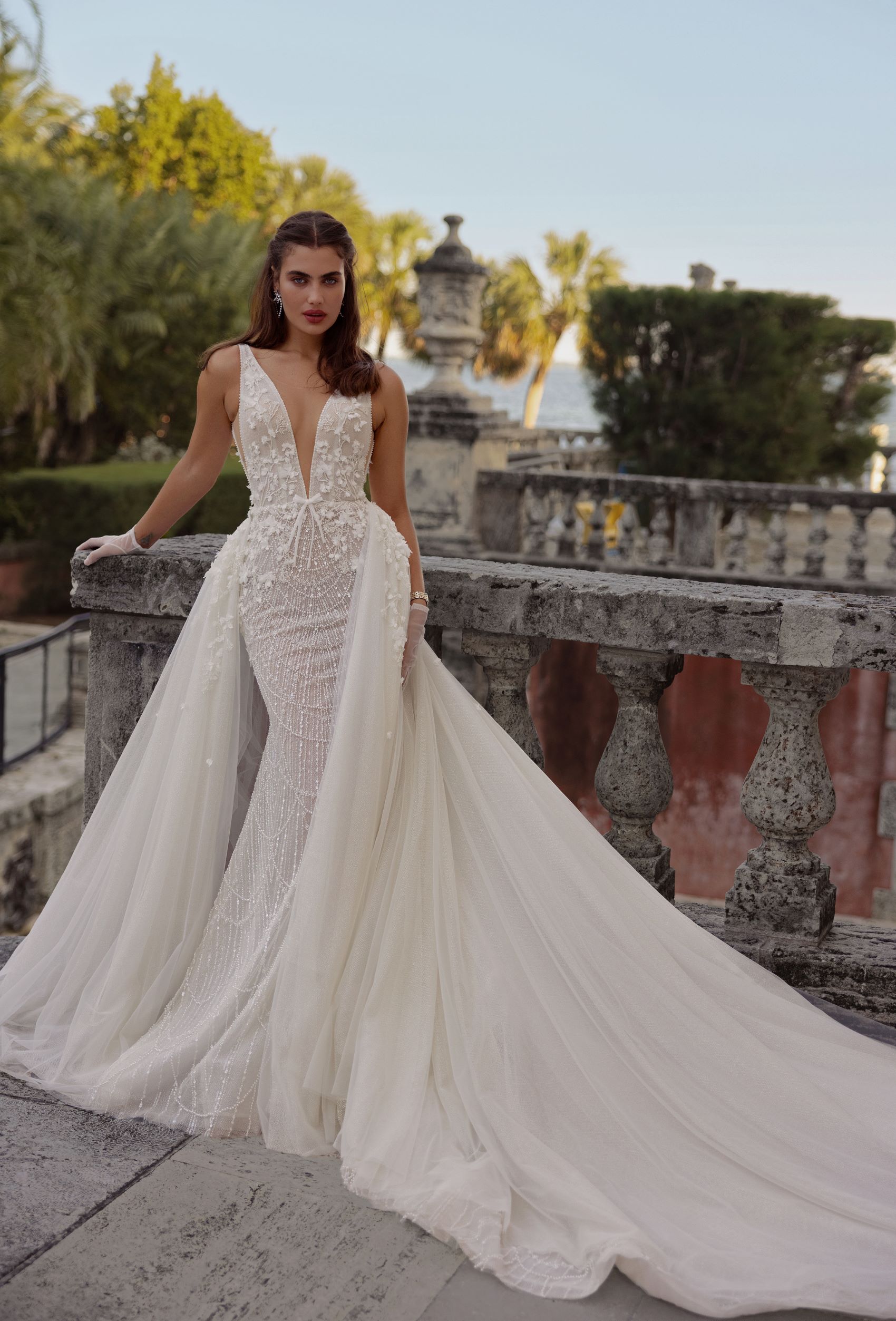 Indulge in the ultimate elegance with this mermaid wedding dress. The 3D floral lace on the corset and shiny lace on the bottom create a stunning contrast. The deep cut V-neckline adds a touch of sultriness to the ensemble. A detachable tulle skirt with a long train is created for a dramatic entrance and exit. Walk down the aisle feeling confident and glamorous in this breathtaking gown.